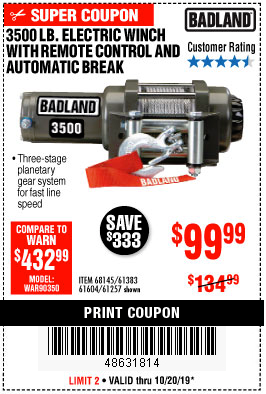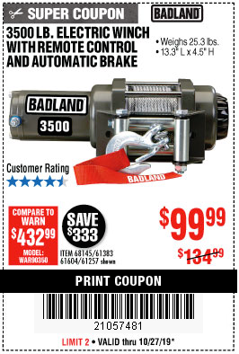 3500 LB. ELECTRIC WINCH WITH REMOTE CONTROL AND AUTOMATIC BRAKE Lot No. 61383/61604/61257 Expired: 10/27/19 - $99.99 Coupon Code: '21057481'