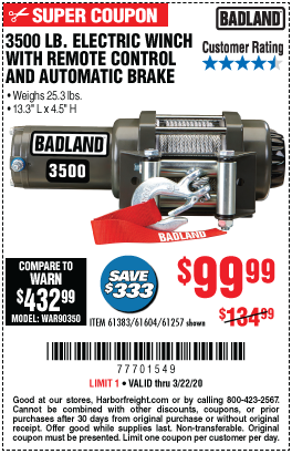 3500 LB. ELECTRIC WINCH WITH REMOTE CONTROL AND AUTOMATIC BRAKE Lot No. 61383/61604/61257 Expired: 3/31/15 - $129.99 Coupon Code: '90113429'