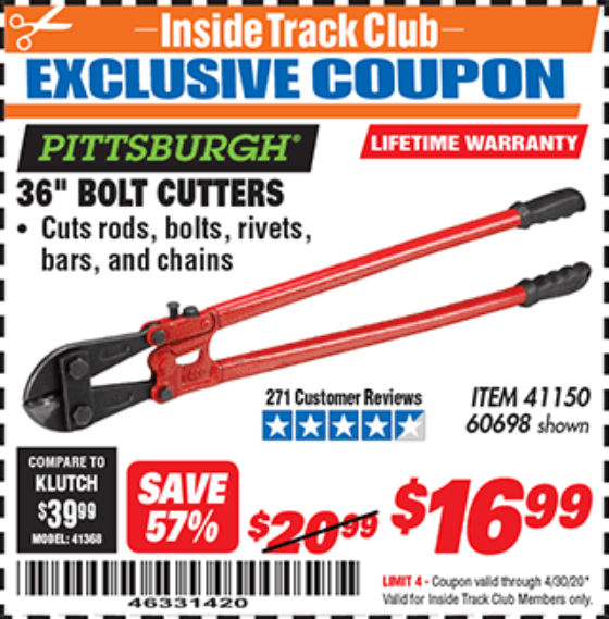 ITC 36" BOLT CUTTERS Lot No. 41150/60698 Expired: 4/30/20 - $16.99 Coupon Code: '46331420'
