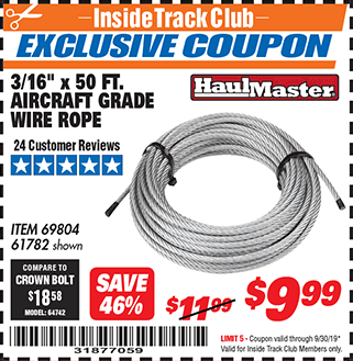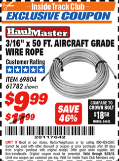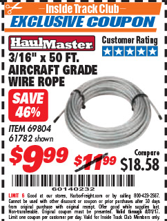 ITC 3/16" X 50 FT. AIRCRAFT GRADE WIRE ROPE Lot No. 69804/61782 Expired: 8/31/17 - $9.99 Coupon Code: '60140232'