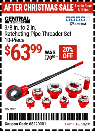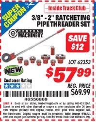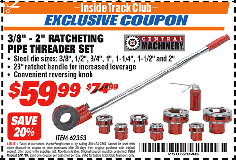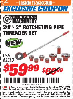 ITC 3/8" - 2" RATCHETING PIPE THREADER SET Lot No. 62353 Expired: 7/31/17 - $59.99 Coupon Code: '37282517'