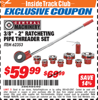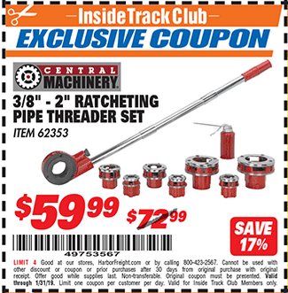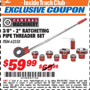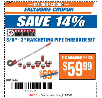 ITC 3/8" - 2" RATCHETING PIPE THREADER SET Lot No. 62353 Expired: 10/31/17 - $59.99 Coupon Code: '31825110'