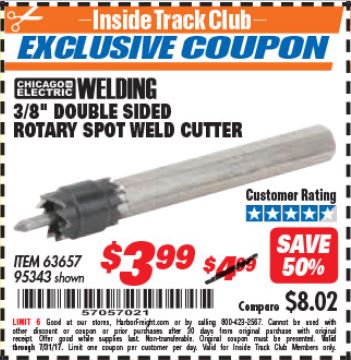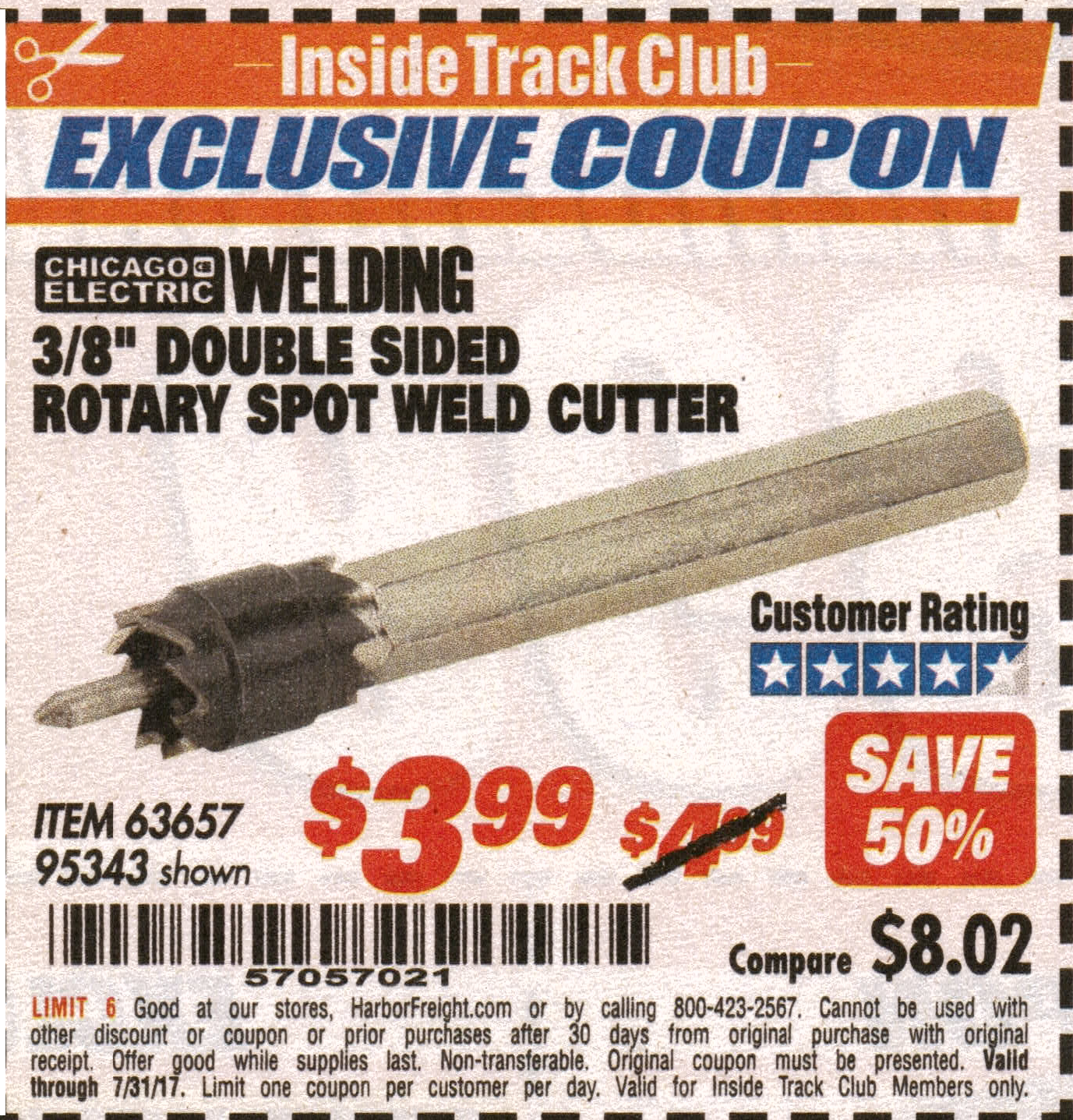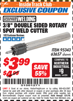 3/8" DOUBLE SIDED ROTARY SPOT WELD CUTTER Lot No. 63657/95343 Expired: 7/31/17 - $3.99 Coupon Code: '57057021'