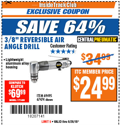 ITC 3/8" REVERSIBLE AIR ANGLE DRILL Lot No. 67474/69495 Expired: 6/26/18 - $24.99 Coupon Code: '18207141'