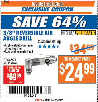 ITC 3/8" REVERSIBLE AIR ANGLE DRILL Lot No. 67474/69495 Expired: 11/6/18 - $24.99 Coupon Code: '19199243'