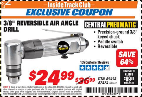 ITC 3/8" REVERSIBLE AIR ANGLE DRILL Lot No. 67474/69495 Expired: 5/12/15 - $29.99 Coupon Code: '39085105'