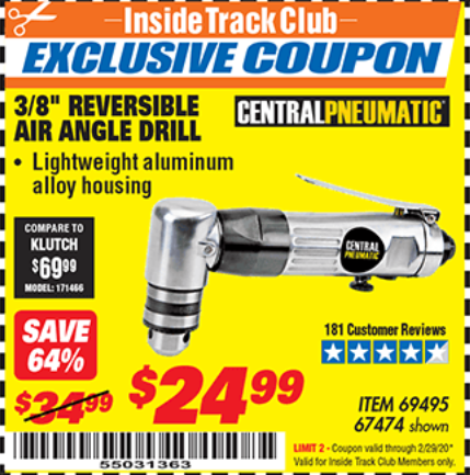 ITC 3/8" REVERSIBLE AIR ANGLE DRILL Lot No. 67474/69495 Expired: 2/29/20 - $24.99 Coupon Code: '55031363'