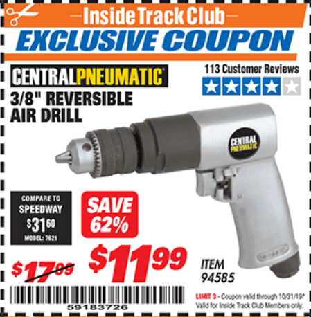 ITC 3/8" REVERSIBLE AIR DRILL Lot No. 94585 Expired: 10/31/19 - $11.99 Coupon Code: '59183726'