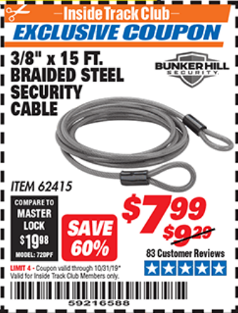 ITC 3/8" X 15 FT. BRAIDED STEEL SECURITY CABLE Lot No. 62415/67706 Expired: 10/31/19 - $7.99 Coupon Code: '59216588'