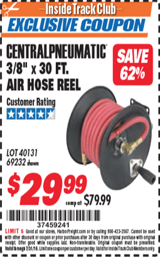 ITC 3/8" X 50 FT. AIR HOSE REEL Lot No. 40131/69232 Expired: 7/31/16 - $29.99 Coupon Code: '37459241'