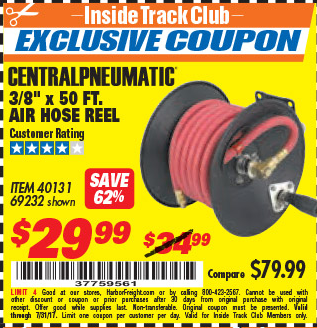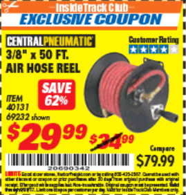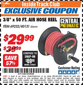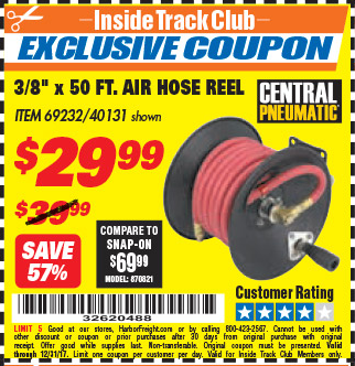 ITC 3/8" X 50 FT. AIR HOSE REEL Lot No. 40131/69232 Expired: 9/30/17 - $29.99 Coupon Code: '20690342'