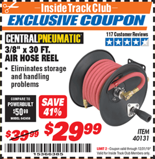 ITC 3/8" X 50 FT. AIR HOSE REEL Lot No. 40131/69232 Expired: 12/31/19 - $29.99 Coupon Code: '15366385'