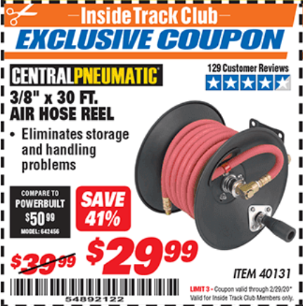 ITC 3/8" X 50 FT. AIR HOSE REEL Lot No. 40131/69232 Expired: 2/29/20 - $29.99 Coupon Code: '54892122'