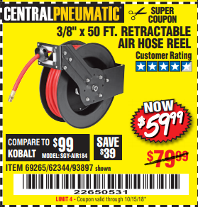 3/8" X 50 FT. AIR HOSE REEL Lot No. 40131/69232 Expired: 10/15/18 - $59.99 Coupon Code: '22650531'