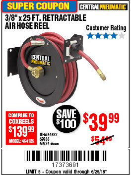 3/8" X 50 FT. AIR HOSE REEL Lot No. 40131/69232 Expired: 6/25/18 - $39.99 Coupon Code: '17373691'