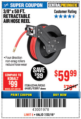 3/8" X 50 FT. AIR HOSE REEL Lot No. 40131/69232 Expired: 7/22/18 - $59.99 Coupon Code: '43001978'