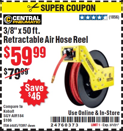 3/8" X 50 FT. AIR HOSE REEL Lot No. 40131/69232 Expired: 3/1/21 - $59.99 Coupon Code: '24760373'