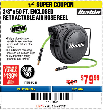 3/8" X 50 FT. ENCLOSED RETRACTABLE AIR HOSE REEL Lot No. 56876 Expired: 9/2/18 - $79.99 Coupon Code: '14441934'