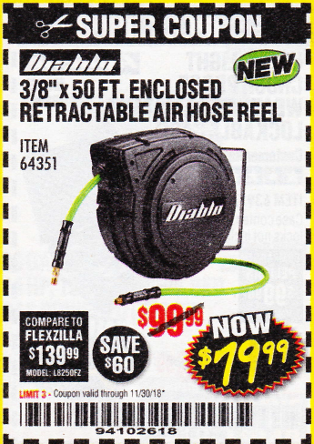3/8" X 50 FT. ENCLOSED RETRACTABLE AIR HOSE REEL Lot No. 56876 Expired: 11/30/18 - $79.99 Coupon Code: '94102618'