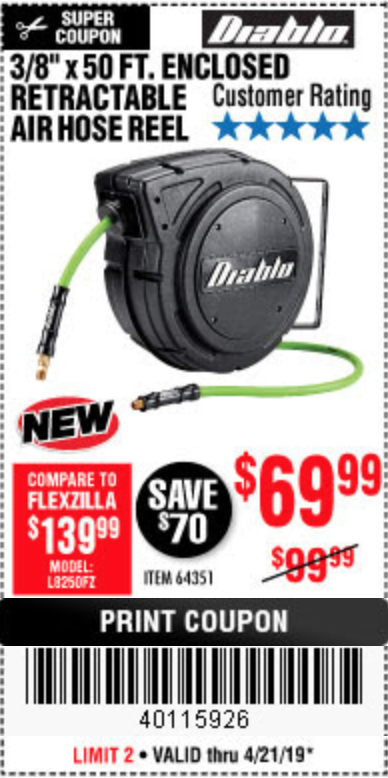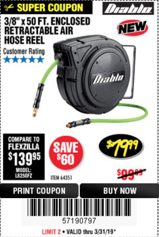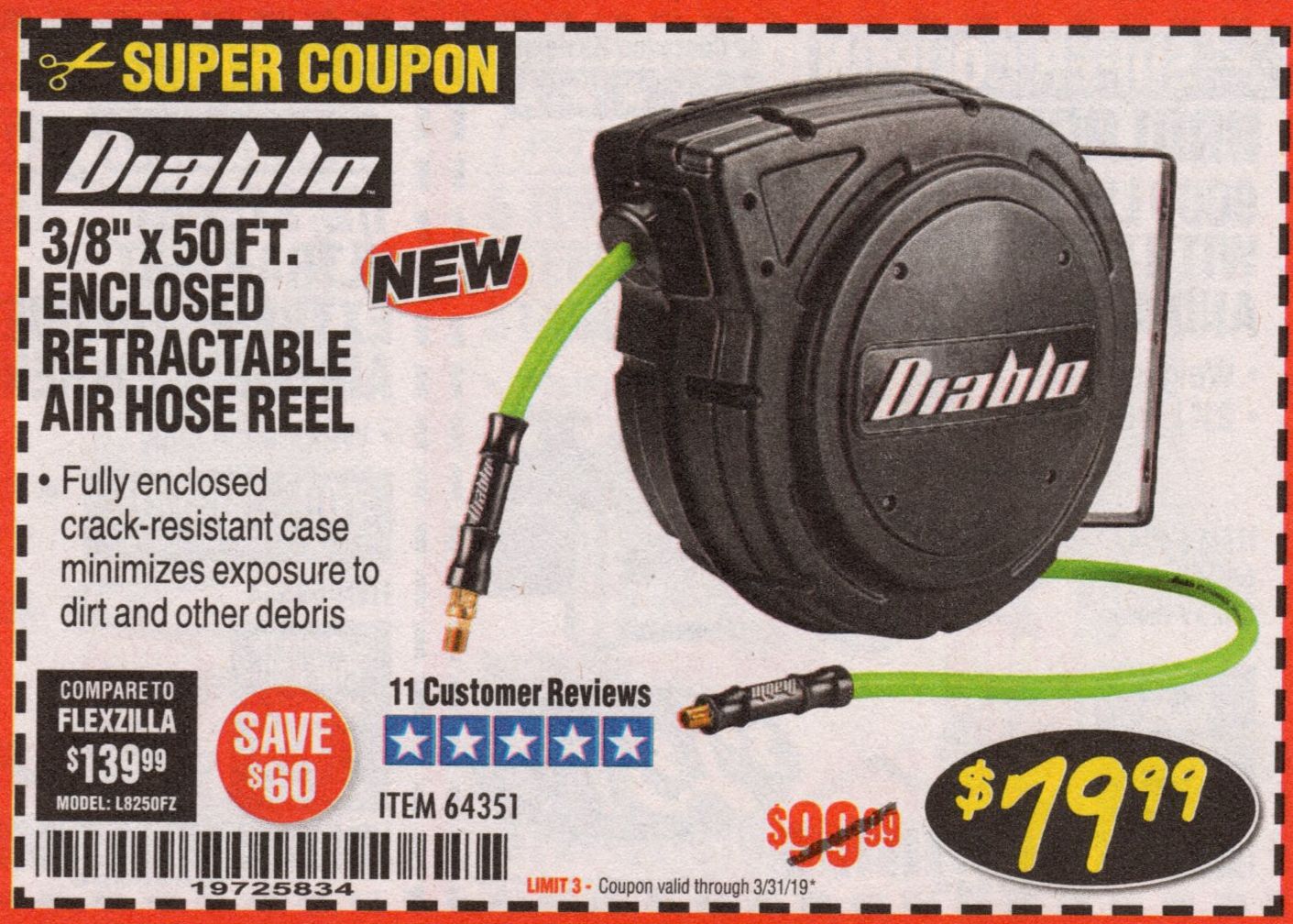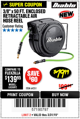 3/8" X 50 FT. ENCLOSED RETRACTABLE AIR HOSE REEL Lot No. 56876 Expired: 3/31/19 - $79.99 Coupon Code: '57190797'