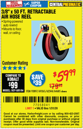 3/8" X 50 FT. ENCLOSED RETRACTABLE AIR HOSE REEL Lot No. 56876 Expired: 1/31/20 - $59.99 Coupon Code: '77058041'