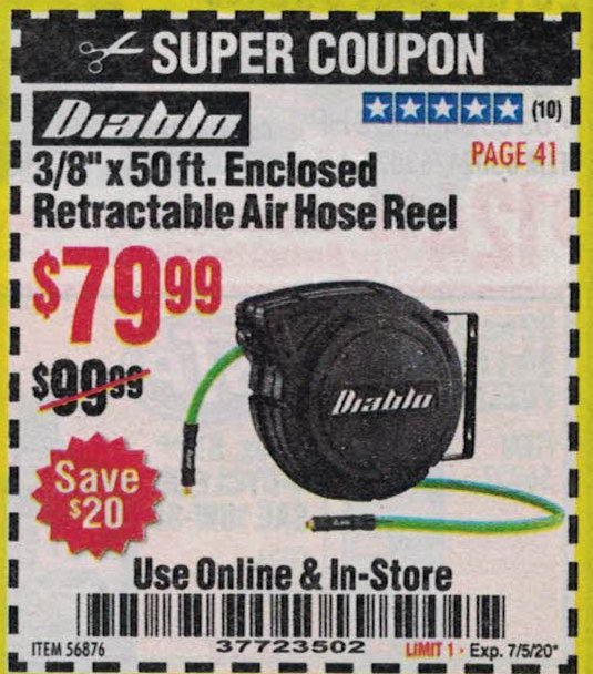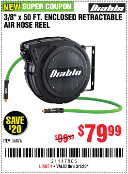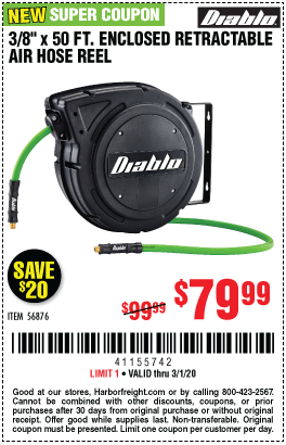3/8" X 50 FT. ENCLOSED RETRACTABLE AIR HOSE REEL Lot No. 56876 Expired: 3/1/20 - $79.99 Coupon Code: '41155742'