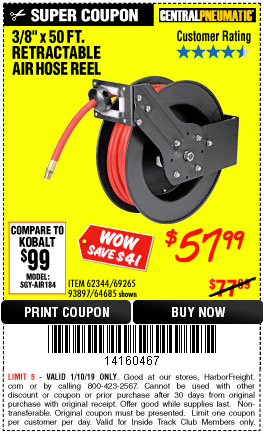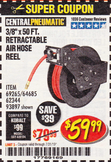 3/8" X 50 FT. RETRACTABLE AIR HOSE REEL Lot No. 46320/69265/62344/64685/93897 Expired: 7/31/19 - $59.99 Coupon Code: '17769169'
