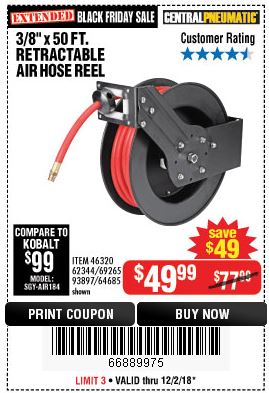 3/8" X 50 FT. RETRACTABLE AIR HOSE REEL Lot No. 46320/69265/62344/64685/93897 Expired: 2/3/19 - $59.99 Coupon Code: '53769302'