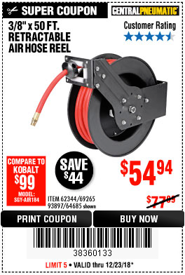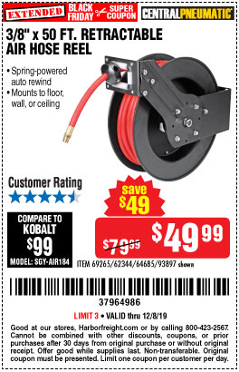 3/8" X 50 FT. RETRACTABLE AIR HOSE REEL Lot No. 46320/69265/62344/64685/93897 Expired: 11/30/19 - $59.99 Coupon Code: '2172701'