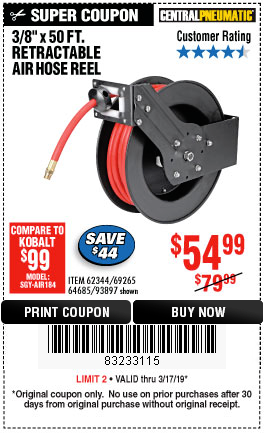 3/8" X 50 FT. RETRACTABLE AIR HOSE REEL Lot No. 46320/69265/62344/64685/93897 Expired: 3/17/19 - $54.99 Coupon Code: '83233115'