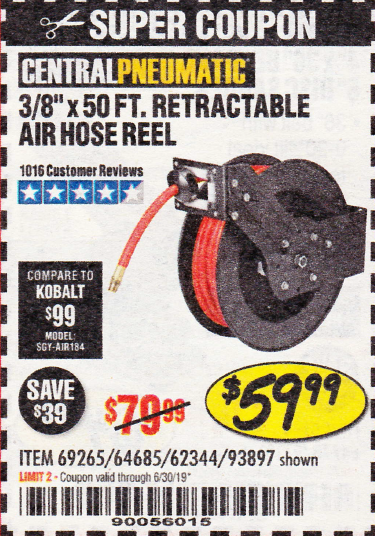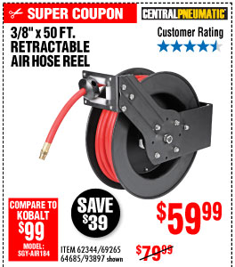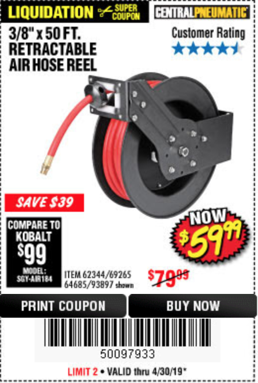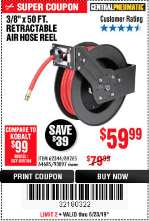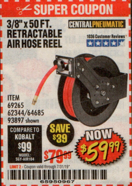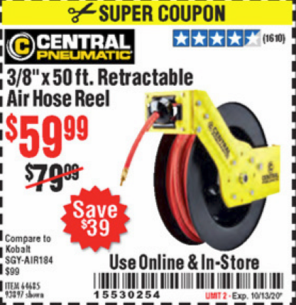 3/8" X 50 FT. RETRACTABLE AIR HOSE REEL Lot No. 46320/69265/62344/64685/93897 Expired: 7/21/19 - $59.99 Coupon Code: '39901392'