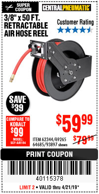 3/8" X 50 FT. RETRACTABLE AIR HOSE REEL Lot No. 46320/69265/62344/64685/93897 Expired: 4/21/19 - $59.99 Coupon Code: '40115378'