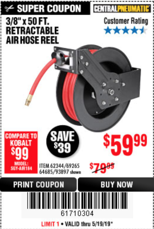 3/8" X 50 FT. RETRACTABLE AIR HOSE REEL Lot No. 46320/69265/62344/64685/93897 Expired: 5/19/19 - $59.99 Coupon Code: '71173823'
