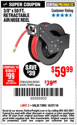 3/8" X 50 FT. RETRACTABLE AIR HOSE REEL Lot No. 46320/69265/62344/64685/93897 Expired: 10/27/19 - $59.99 Coupon Code: '88988900'