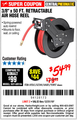 3/8" X 50 FT. RETRACTABLE AIR HOSE REEL Lot No. 46320/69265/62344/64685/93897 Expired: 12/31/19 - $54.99 Coupon Code: '94128173'