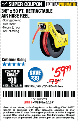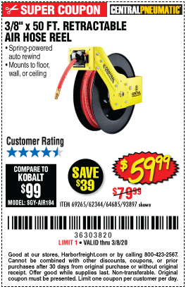 3/8" X 50 FT. RETRACTABLE AIR HOSE REEL Lot No. 46320/69265/62344/64685/93897 Expired: 2/7/20 - $59.99 Coupon Code: '15108529'