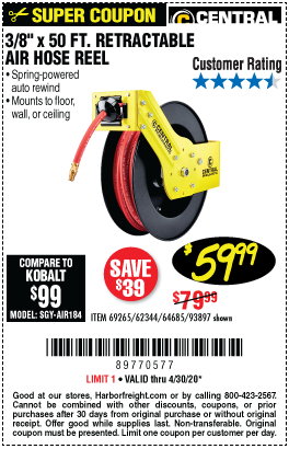 3/8" X 50 FT. RETRACTABLE AIR HOSE REEL Lot No. 46320/69265/62344/64685/93897 Expired: 3/22/20 - $59.99 Coupon Code: '77553433'