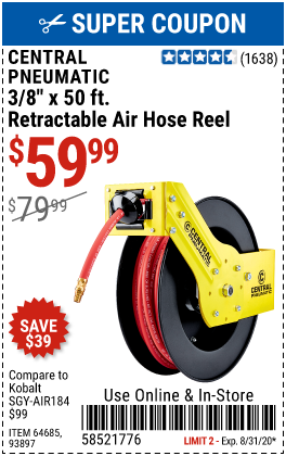 3/8" X 50 FT. RETRACTABLE AIR HOSE REEL Lot No. 46320/69265/62344/64685/93897 Expired: 8/31/20 - $59.99 Coupon Code: '58521776'