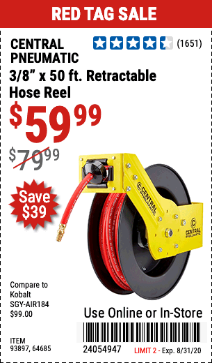 3/8" X 50 FT. RETRACTABLE AIR HOSE REEL Lot No. 46320/69265/62344/64685/93897 Expired: 8/31/20 - $59.99 Coupon Code: '24054947'