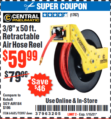 3/8" X 50 FT. RETRACTABLE AIR HOSE REEL Lot No. 46320/69265/62344/64685/93897 Expired: 1/15/21 - $59.99 Coupon Code: '37963205'