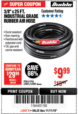 3/8"X25FT. INDUSTRIAL GRADE RUBBER AIR HOSE Lot No. 61936/62885/62889 Expired: 11/11/18 - $9.99 Coupon Code: '19440156'