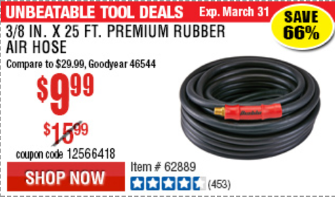 3/8"X25FT. INDUSTRIAL GRADE RUBBER AIR HOSE Lot No. 61936/62885/62889 Expired: 3/31/19 - $9.99 Coupon Code: '12566418'