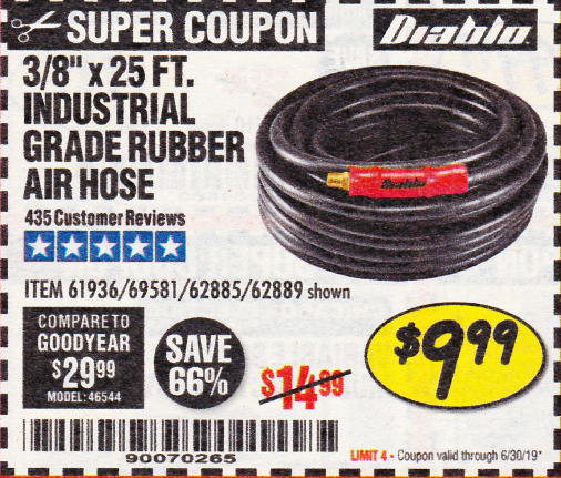 3/8"X25FT. INDUSTRIAL GRADE RUBBER AIR HOSE Lot No. 61936/62885/62889 Expired: 6/30/19 - $9.99 Coupon Code: '90070265'