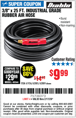 3/8"X25FT. INDUSTRIAL GRADE RUBBER AIR HOSE Lot No. 61936/62885/62889 Expired: 2/17/20 - $9.99 Coupon Code: '75736373'