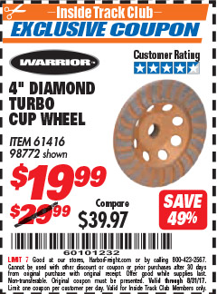 ITC 4" DIAMOND TURBO CUP WHEEL Lot No. 61416/98772 Expired: 8/31/17 - $19.99 Coupon Code: '60101232'