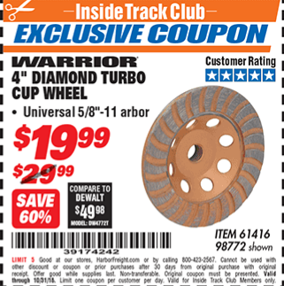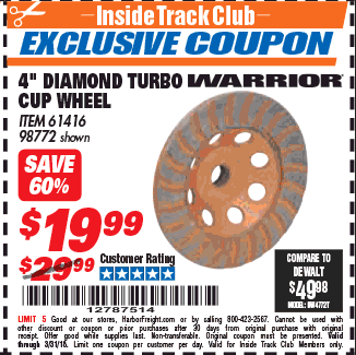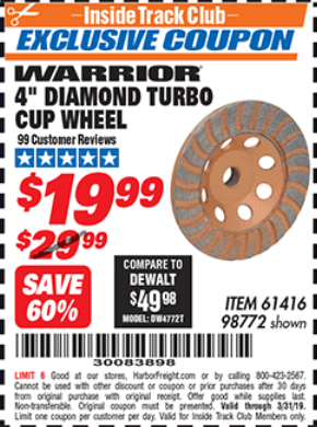 ITC 4" DIAMOND TURBO CUP WHEEL Lot No. 61416/98772 Expired: 3/31/19 - $19.99 Coupon Code: '30083898'