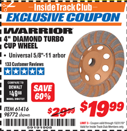 ITC 4" DIAMOND TURBO CUP WHEEL Lot No. 61416/98772 Expired: 10/31/19 - $19.99 Coupon Code: '59191908'
