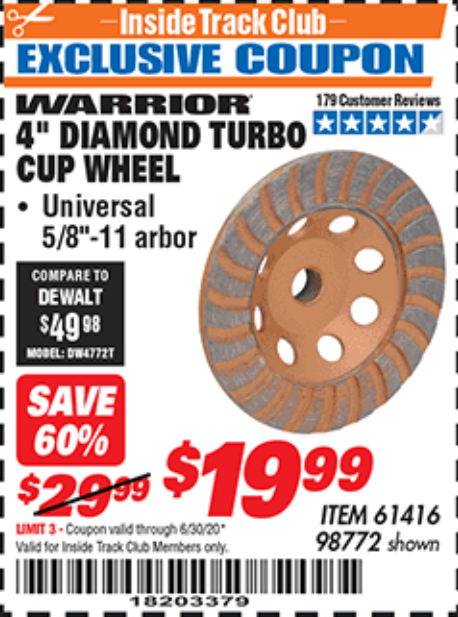 ITC 4" DIAMOND TURBO CUP WHEEL Lot No. 61416/98772 Expired: 6/30/20 - $19.99 Coupon Code: '18203379'