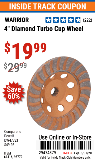 ITC 4" DIAMOND TURBO CUP WHEEL Lot No. 61416/98772 Expired: 8/31/20 - $19.99 Coupon Code: '29474379'