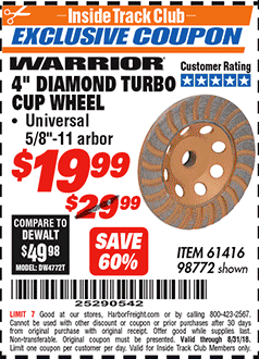 ITC 4" DIAMOND TURBO CUP WHEEL Lot No. 61416/98772 Expired: 1/31/19 - $19.99 Coupon Code: '51406025'